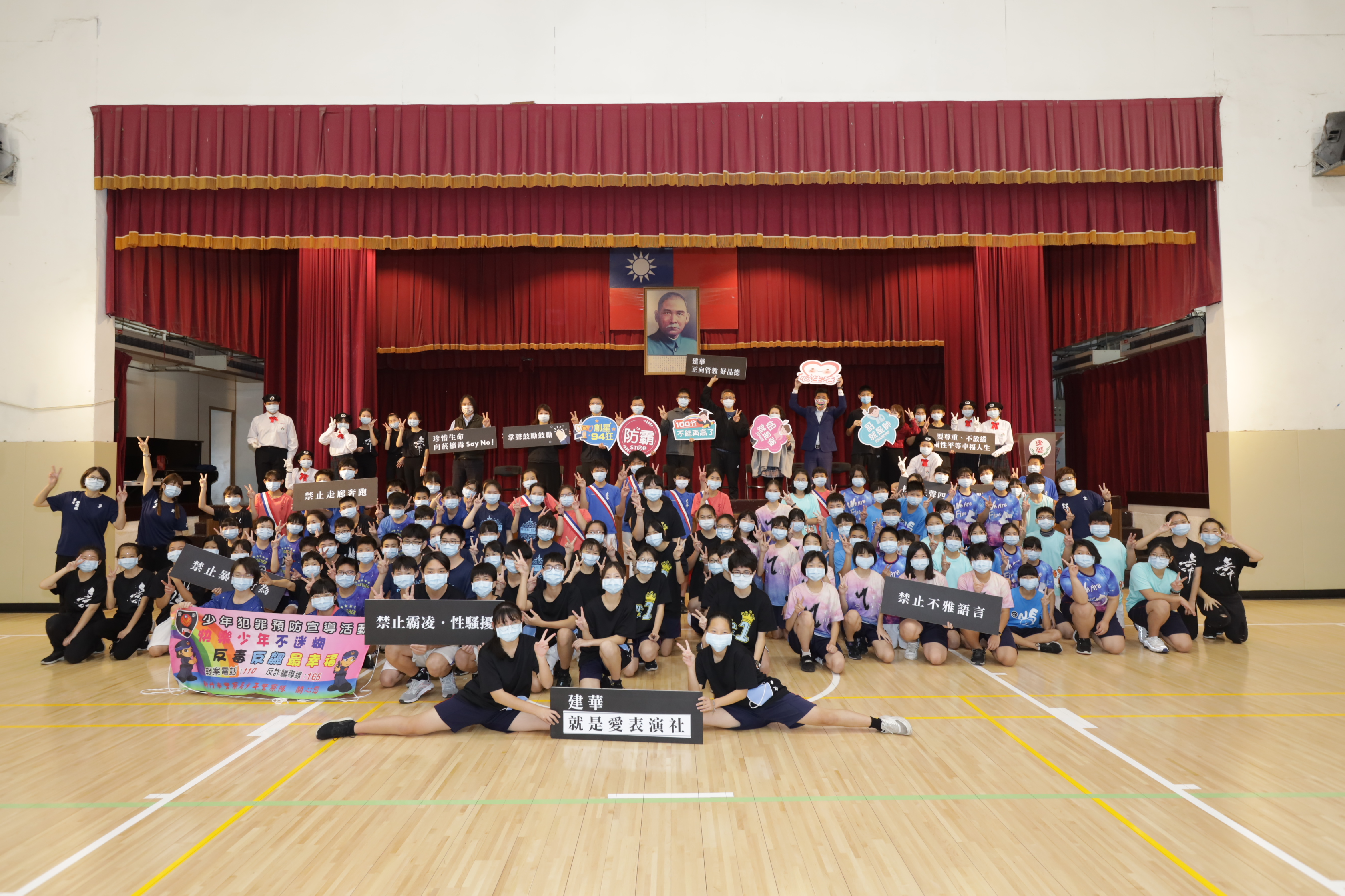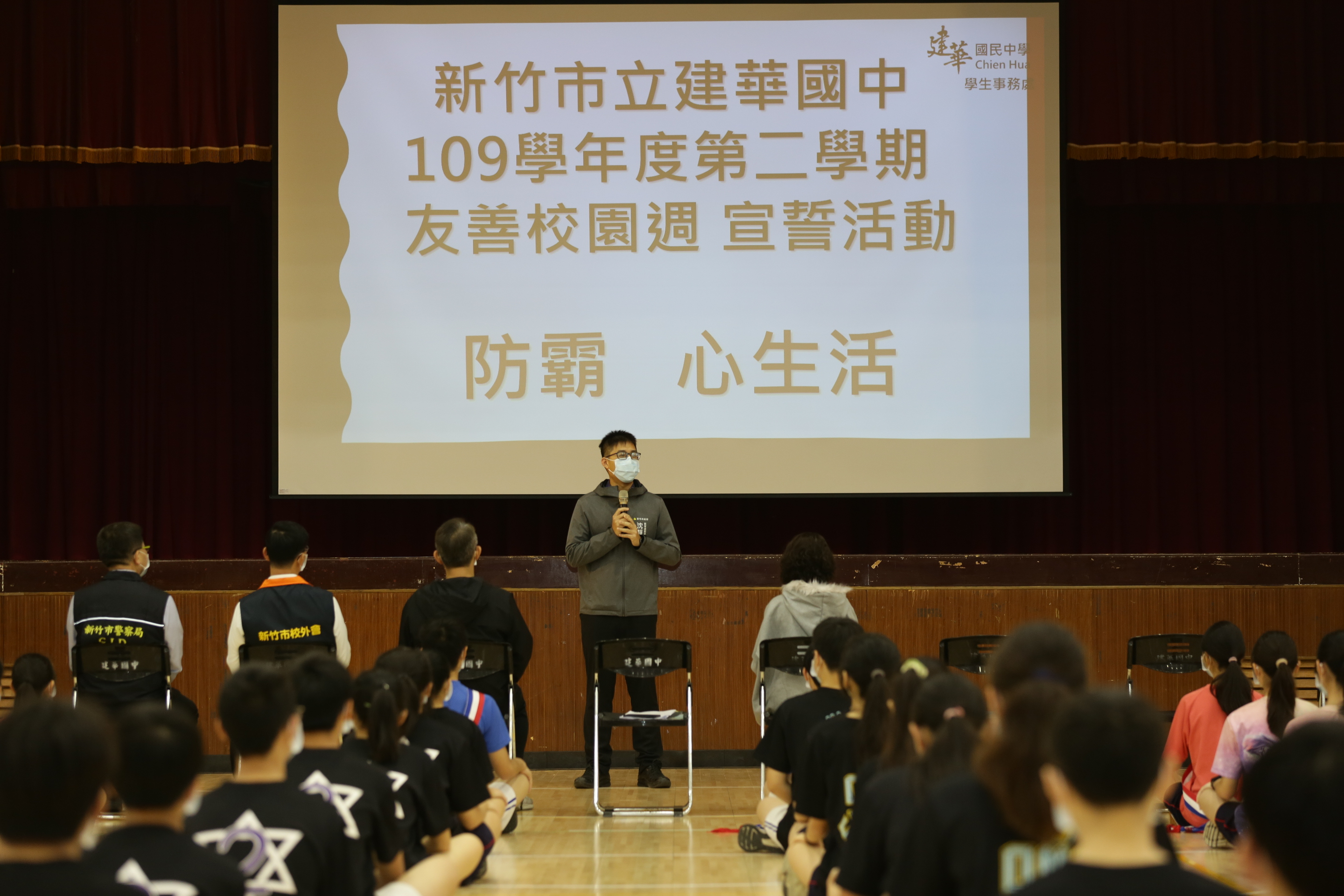 本市建華國中於今日辦理109學年度第2學期開學週友善校園宣導「防霸,心生活」,學子團隊接續展出反毒、反霸凌樂舞多元節目,活力充沛、全力以赴的氣質,讓與會者留下極為深刻的印象。除教育處代理處長沈靜濤代表市長出席,教育部新竹市聯絡處暨學生校外生活輔導委員會吳晃廷督導及警察局少年隊指派代表劉煥清組長共同參與外,本市市議會陳建名議員以及學校家長會會長吳佩祈也到場,一齊表達對校園友善議題的關注。