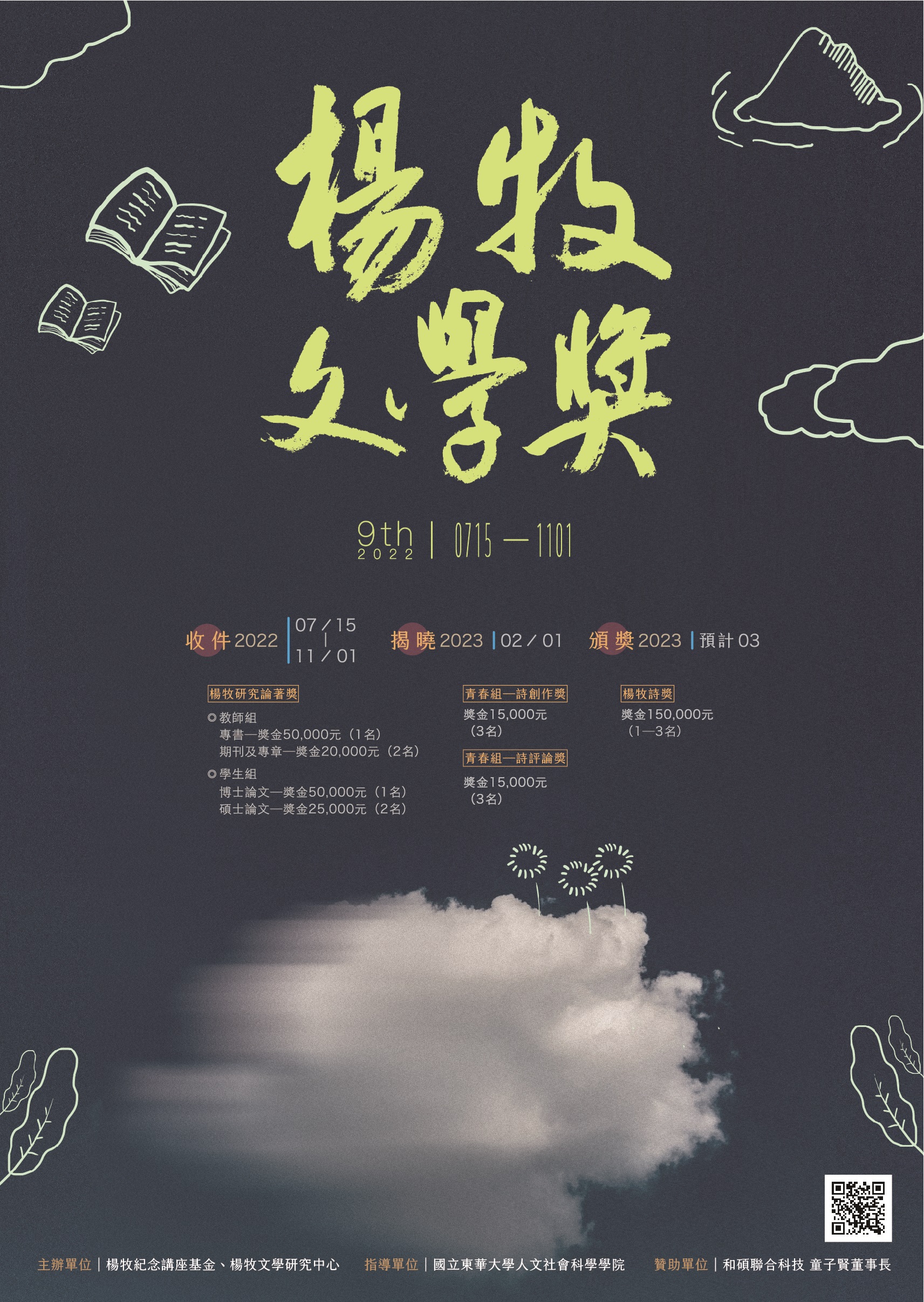 一、「第九屆楊牧文學獎」針對大學及研究所徵文獎項為「楊牧詩獎」及「楊牧研究論著獎」;針對國、高中生徵文獎項為「青春組‧詩創作」、「青春組‧詩評論」,希冀鼓勵國內創作風氣及閱讀楊牧作品,培養文學涵養。