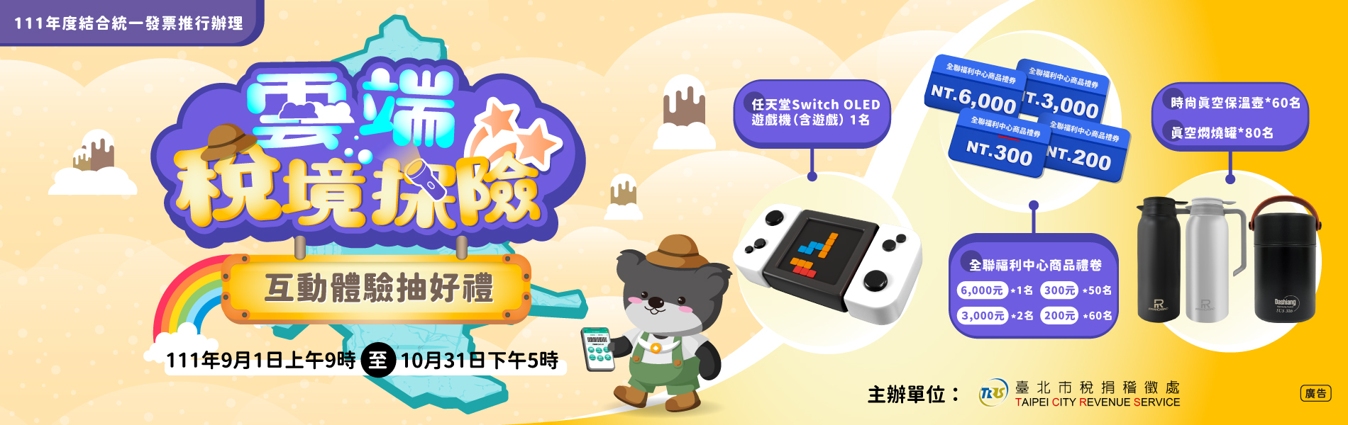 二、活動內容:於活動期間進入活動網頁,在「雲端稅境」線上展覽館學習各項租稅知識,並且於互動解謎後填寫問卷,以及完成指定的雲端發票及租稅遊戲任務,就有機會獲得任天堂Switch、商品禮券等大獎。