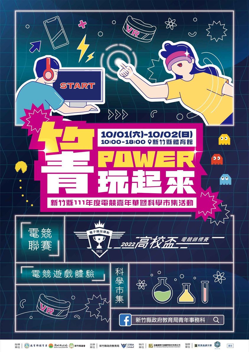 主旨:有關本局辦理「菁Power玩起來-新竹電競嘉年華暨科學市 集」活動,惠請貴單位協助公告並鼓勵青年學子踴躍參 加,詳如說明,請查照。 說明: 一、為活絡本縣青年族群才藝能量並加強互動,特以青年族群 熱愛的電子競技運動為活動主軸,內容除辦理高中電競聯 賽,並規劃設置10組電競遊戲體驗攤位,號召青年進行交 流,展露活力;另活動亦安排20攤科學市集活動及親子手 作攤位等,廣邀青年及親子族群踴躍参與科普終身學習, 透過設計有趣科普闆關,用遊戲引領學習、用體驗啟發科 學的好奇心。 二、活動時間:111年10月1日(六)至10月2日(日)上午十時 至下午六時。 三、活動地點:新竹縣體育館。 四、檢附活動海報電子檔乙份。