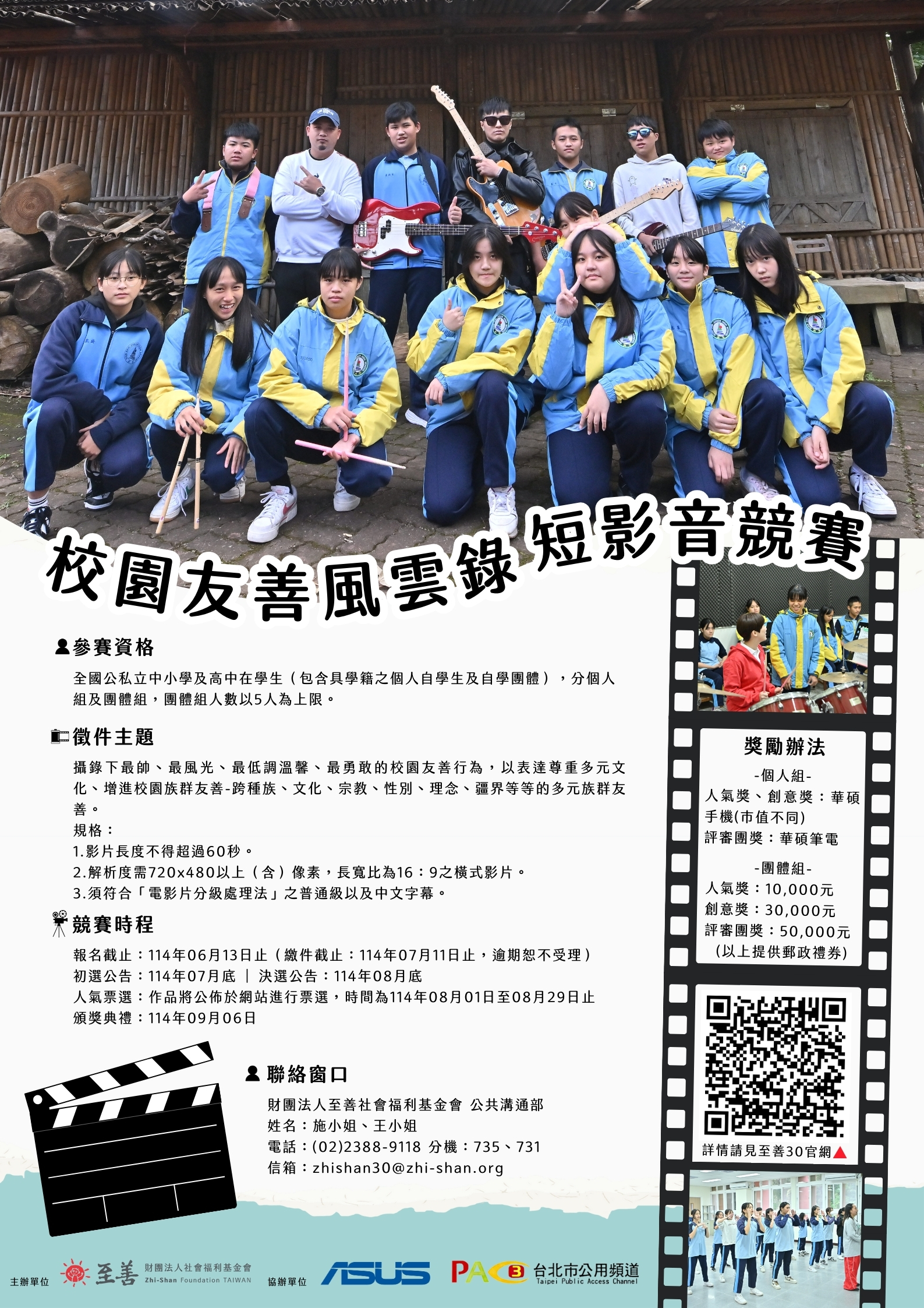 一、財團法人至善社會福利基金會自2023年起倡議「校園族群友善」,已連續兩年舉辦校園族群友善獎。2025年將辦理「校園友善風雲錄-短影音競賽」,邀請全國國小至高中學生共同參與,促進校園友善。旨揭徵件活動簡章,摘述重點如下: