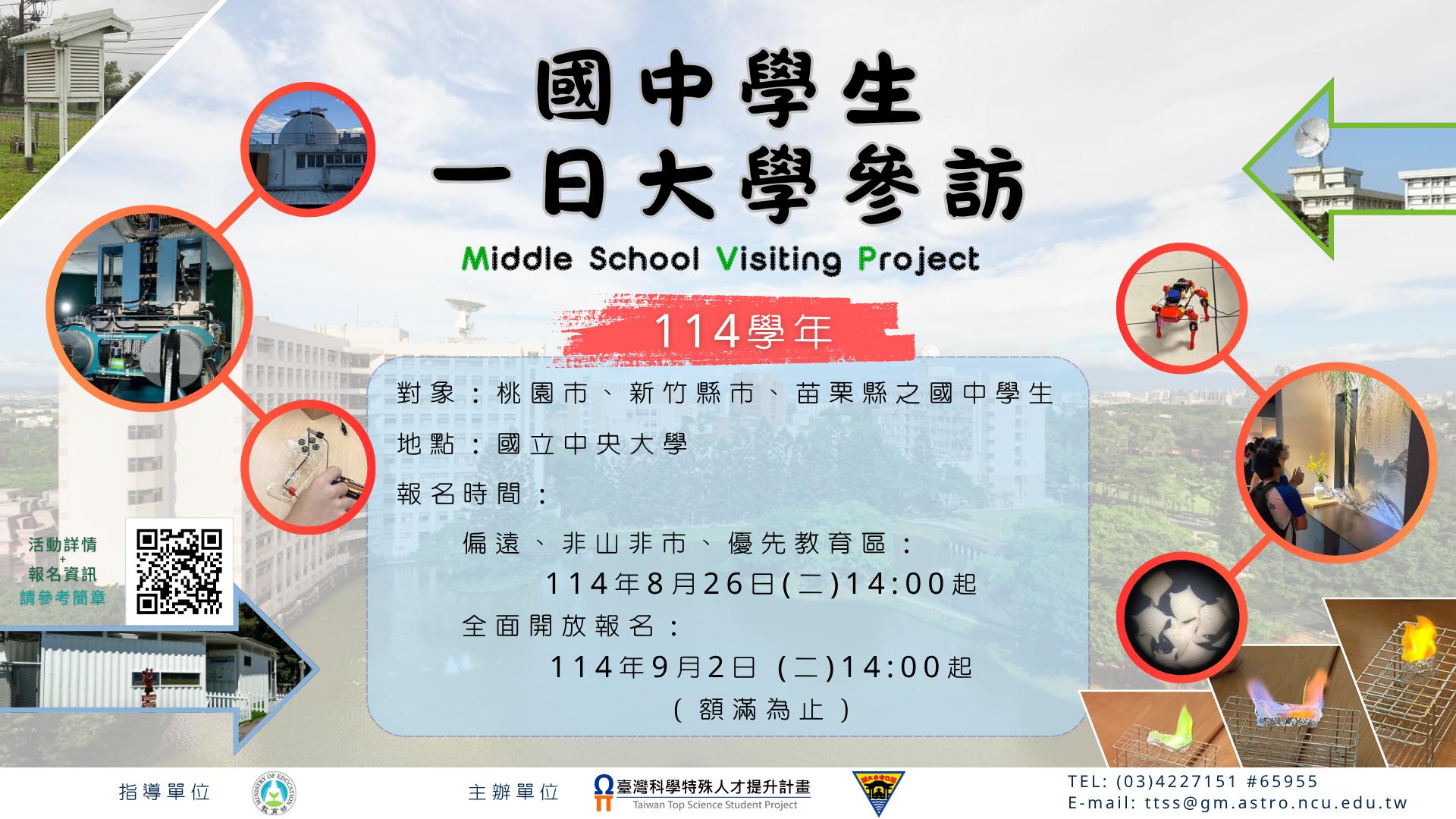 轉知國立中央大學訂於114年10月1日至115年6月30日辦理「國中學生一日大學參訪」活動,請各校師生踴躍報名參加。(如附件)