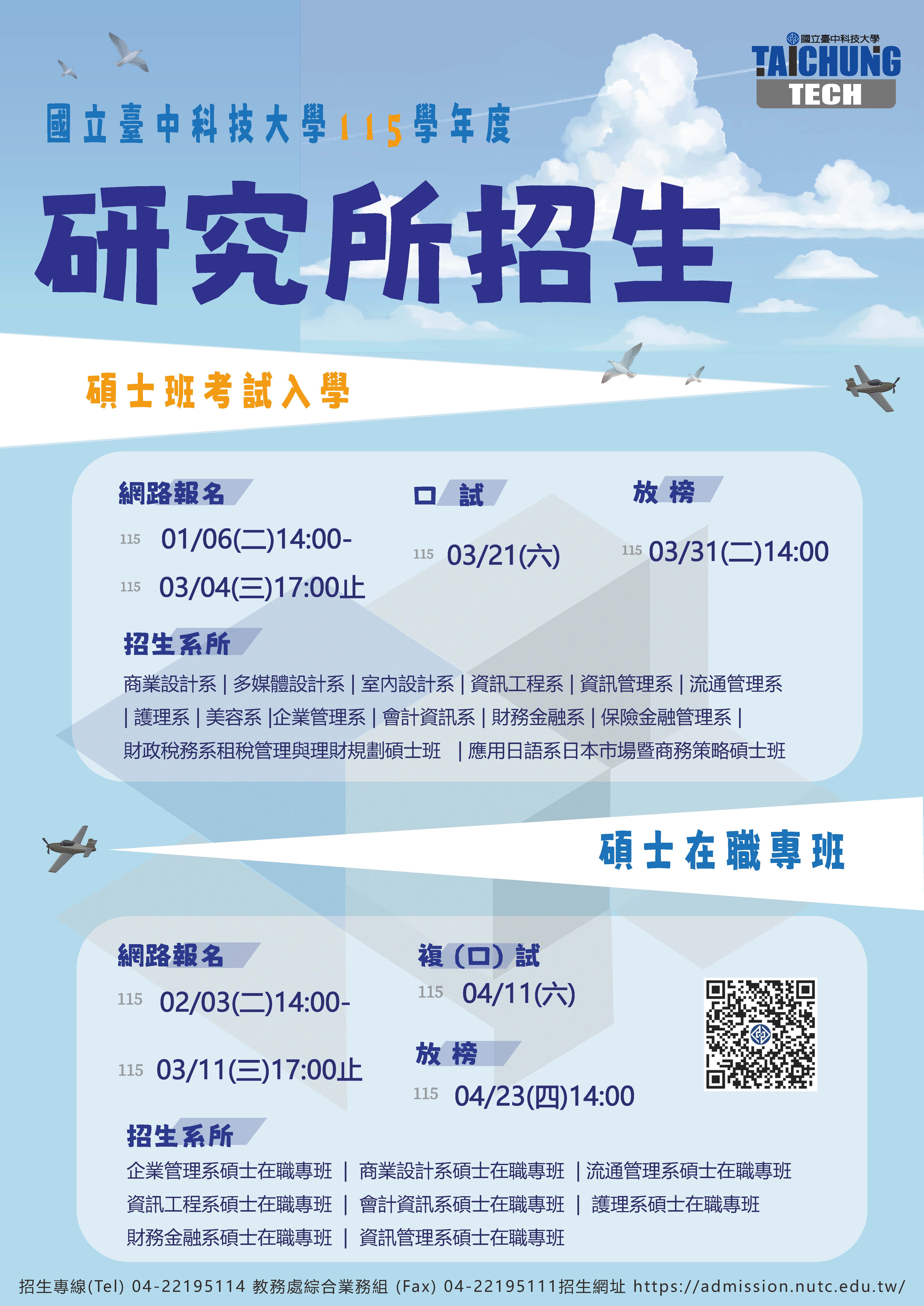 一、依據國立臺中科技大學114年12月11日中科大教綜字第1140025135號函辦理。 二、招生系所:商業設計系(含碩專班)、多媒體設計系、室內設計系、資訊工程系(含碩專班)、資訊管理系(含碩專班)、流通管理系(含碩專班)、企業管理系(含碩專班)、會計資訊系(含碩專班)、財務金融系(含碩專班)、財政稅務系租稅管理與理財規劃碩士班、應用日語系日本市場暨商務策略碩士班、保險金融管理系、護理系(含碩專班)、美容系等,共計14個系所。 三、採網路報名方式,報名日期: (一)碩士班:115年3月21日(星期六)。 (二)碩士在職專班:115年4月11日(星期六)。 四、招生名額、報考資格、考試項目、指定繳交審查資料等相關訊息,請詳見該校招生簡章,或請至該校招生網站(http://admission.nutc.edu.tw/)查詢。