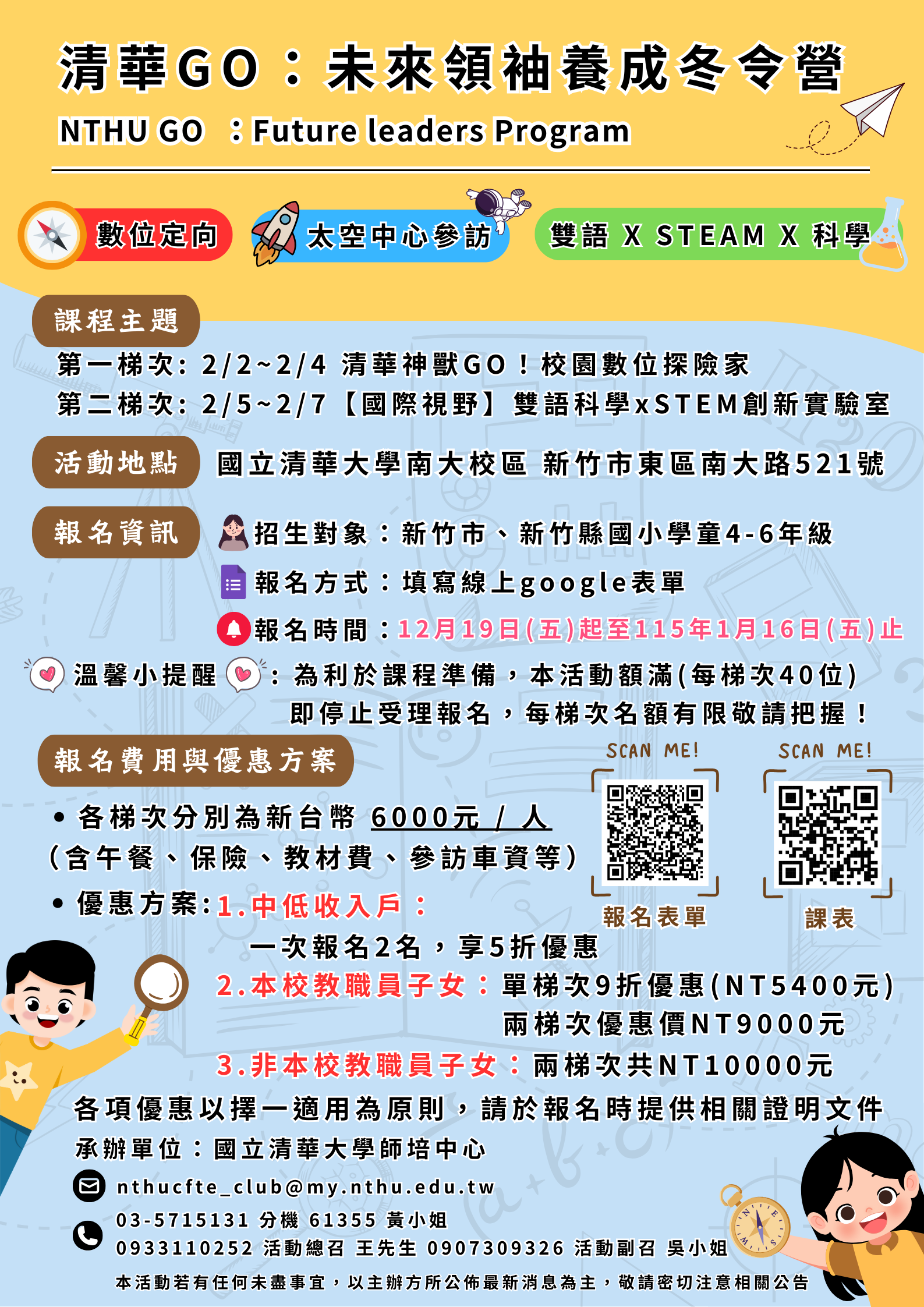 轉知國立清華大學師資培育中心辦理「清華 GO:未來領袖養成冬令營 (NTHU GO: Future leaders Program)」。(如附件)