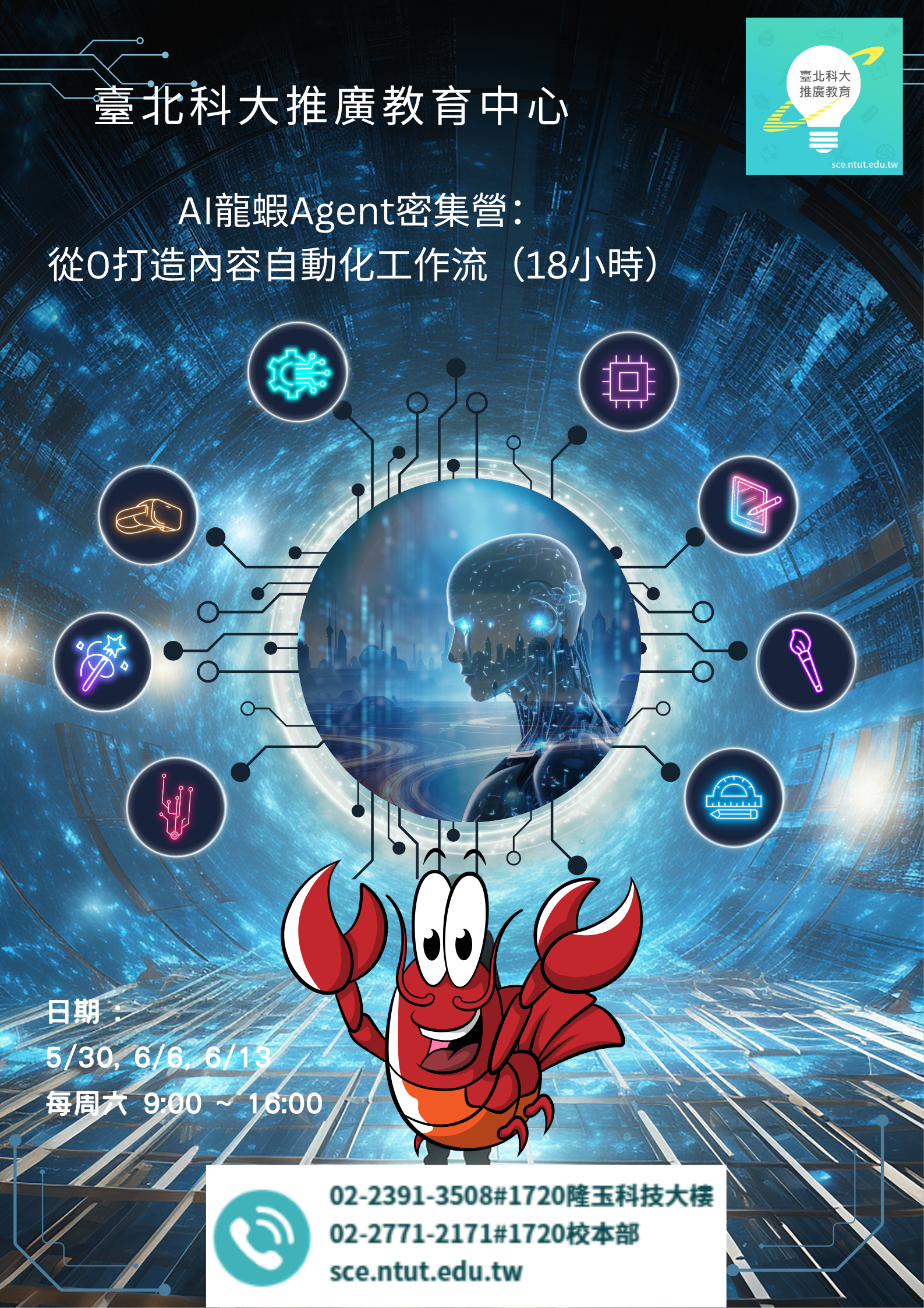 一、 因應人工智慧技術快速發展,AI Agent(自動化智能代理)已成為提升工作效率與數位轉型之關鍵工具。透過AI圖文影音生成與自動化流程整合,可有效協助個人及企業優化內容產出、行銷推廣及日常作業。 二、 本課程以「AI圖文影音生成 × 龍蝦Agent自動化應用」為核心,透過系統化教學與實作演練,協助學員建立AI應用能力,並完成自動化內容產出流程。 三、 檢附相關課程活動訊息及文宣資料(如附件)。 四、 活動資訊請以google 搜尋: 「AI龍蝦Agent密集營:從0打造內容自動化工作流(18小時)」、進入本校活動網頁查詢,或請來電本校推廣教育中心(02)2771-2171或(02 )2391-3508 分機1720、1718。