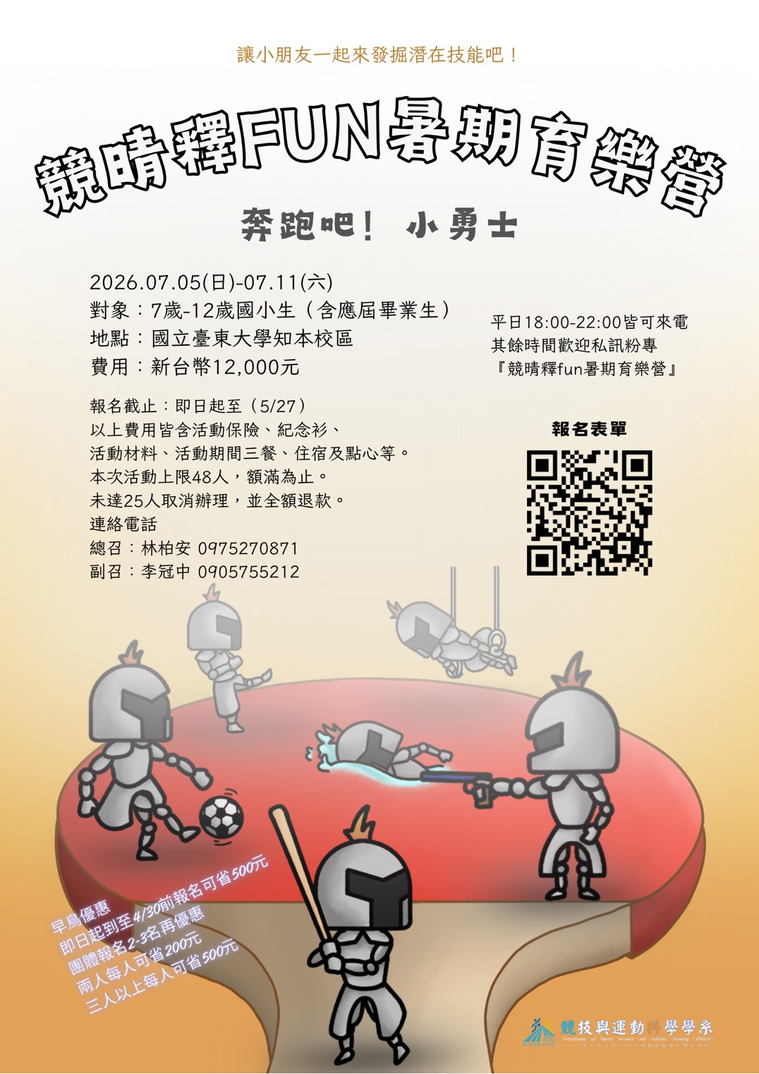【轉知】國立臺東大學競技與運動科學學系系學會辦理2026年暑假營隊活動「競晴釋放暑期育樂營─奔跑吧,小勇士!」