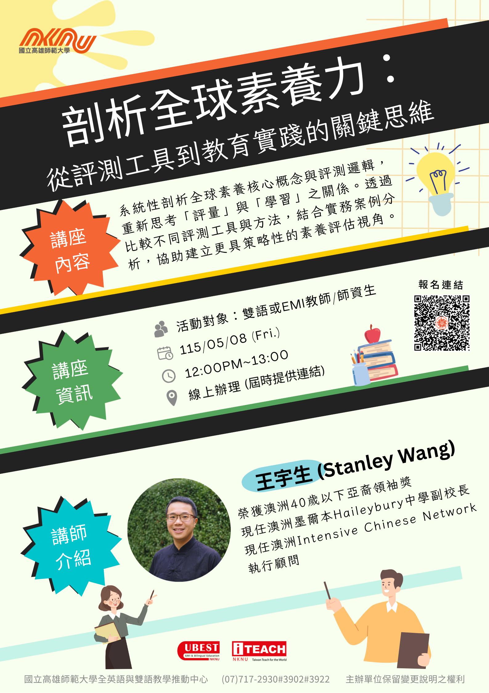 二、 本講座邀請澳洲Haileybury中學副校長王宇生(Stanley Wang)主講,內容涵蓋全球素養概念、評測方法比較及教學應用策略。 三、 資訊: (一) 日期:115年5月8日(星期五)。 (二) 時間:12時00分至13時00分。 (三) 方式:線上辦理(錄取後另以電子郵件通知連結)。 (四) 報名連結:|https://forms.gle/kAvWrz96rWmpTSscA