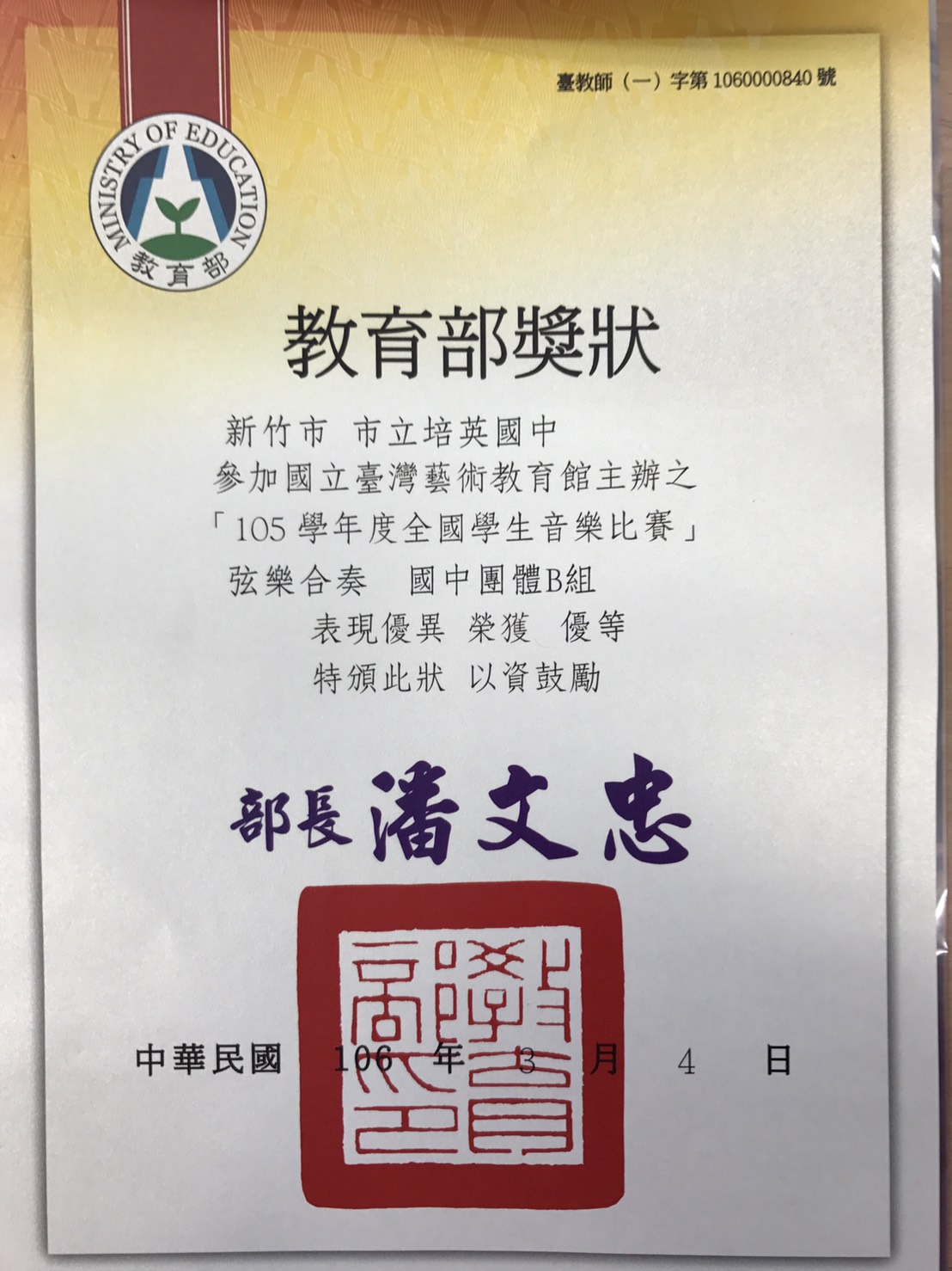 培英弦樂團於103年由校長丁淑觀及家長會積極籌組而成,聘請旅美小提琴演奏碩士江立皓老師擔任指揮,本校音樂老師黃于庭負責團練規劃與社團管理;團員的努力再加上後援會家長全力支持與協助,於成立第一年即參加103學年度全國學生音樂比賽北區決賽,當時更以15人迷你團隊黑馬躍出-奪得優等全國第四名的佳績。現有團員20餘人,主要利用課餘時間及社團時間做分部加強及合奏訓練,透過指揮江立皓老師帶人更帶心的教學方式及嚴謹的管理,除了演奏技巧用心指導外,也對團員做人處事諄諄教誨,因此團員都有好的品性。後援會王文賓會長表示,樂團就像是一個大家庭,孩子們因團練而凝聚、一起玩音樂、一起共學習,在繁忙的國中弦樂團除了學業中,有音樂的陪伴,有助於紓解學業的壓力。由於弦樂樂器是世界上公認最難學習的樂器,一要音準、二要技巧、三要雙手協調,更需要長時間的練習,才能練就紮實基本功。團員主要由非音樂班的同學組成,練習時間大都在課餘,所以除了學業要應付外,需要額外撥出時間練習,更是難能可貴。參與樂團的學生紛紛表示,樂團使得原本枯燥乏味的練琴有不一樣的意義,現在不管分部練習或在家自主練習,都很開心去做。每年弦樂團都積極參與新竹市及全國音樂比賽,連續三年為學校爭光。在培訓的過程中,常常犧牲假期練習,團員倍嘗辛苦,因此培養出團隊情感,也交到跨越年級和班級的好朋友。104、105年更連續2年進軍全國、與其他縣市動輒60人以上的弦樂團相比,僅20人的培英弦樂團表現,絲毫不見遜色,優雅細膩的音樂處理,讓培英弦樂團散發出耀眼的光芒。評審讚譽「此團雖然是人數最少的樂團,但是各聲部表現俐落整齊、顯見訓練有成;音樂處理細膩、樂音乾淨悠揚,聞之令人蕩氣迴腸。」